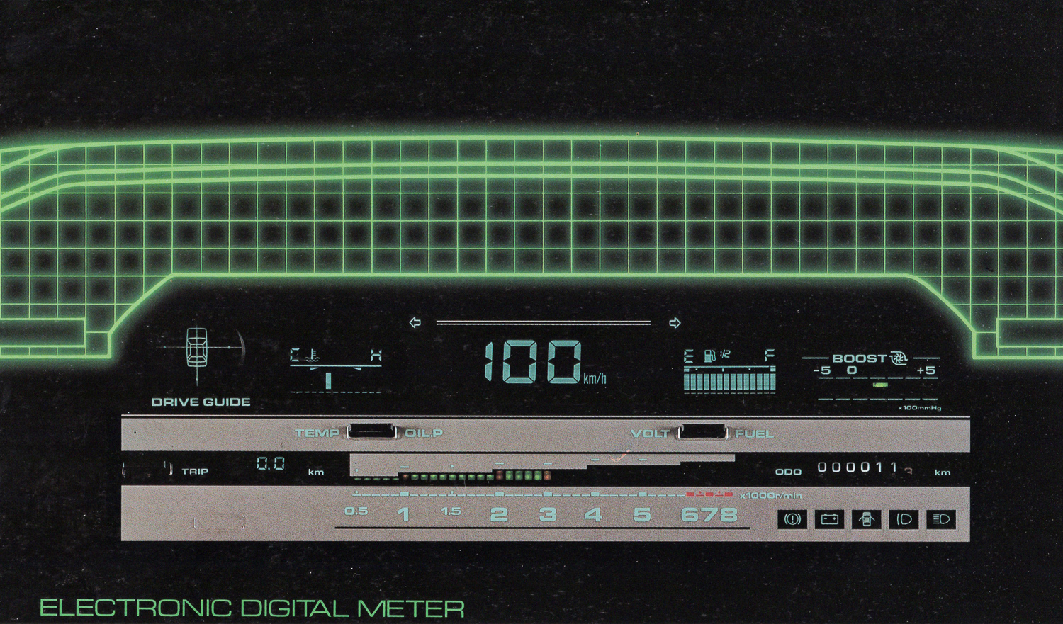 The heart of the new Silvia is an electronic digital meter. The speedometer is in the center, with the water temperature gauge, oil pressure gauge, fuel gauge, and voltmeter on either side, and a tachometer with LEDs on the bottom. A boost gauge and drive guide are newly adopted.