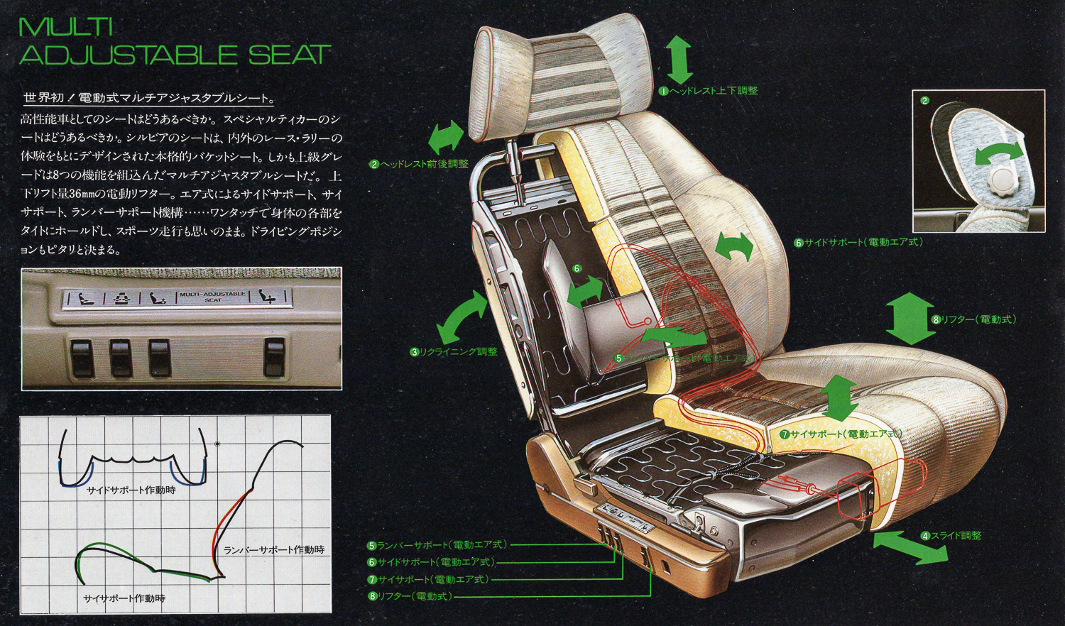 What should seats be like in a high-performance car? What should seats be like in a specialty car? The Silvia's seats are full-fledged bucket seats designed based on experience from domestic and international races and rallies. What's more, the higher-grade models are multi-adjustable seats with eight built-in functions. An electric lifter with a 36mm upper drift. Air-operated side support, thigh support, and lumbar support mechanisms… all parts of the body are tightly held in place with just one touch, allowing for sporty driving to your heart's content. The driving position is also perfectly determined.
