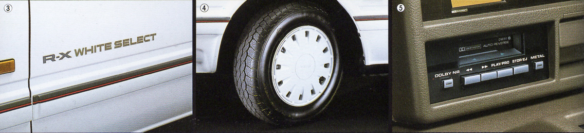 The R-X White Select is the base model of the White Versions and is quite basic compared to its superiors. Equipped with a CA18S carbureted CA engine, it is rated at 100PS. The interior is also of lower specification, missing out on the special black Russel Cloth treatment of the Full White RS-X, instead featuring the brown interior equivalent to the standard MKII R-X Silvia. The R-X White Select is also stripped of the exterior finishing parts, the front lip, side and rear pods.